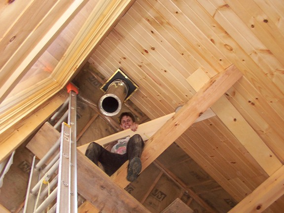 Laurie and I teamed up to complete one side of the ceiling. It took a while to cut each piece around the chimney, but it was worth it. Looks great.